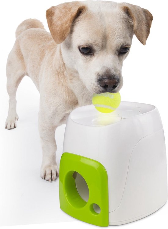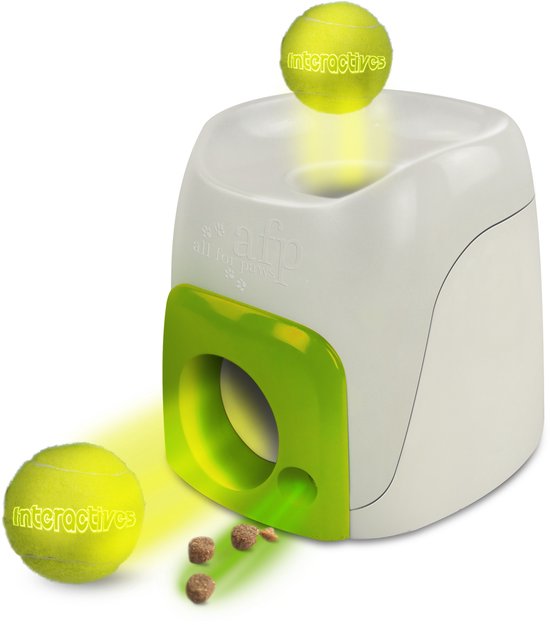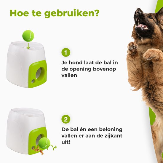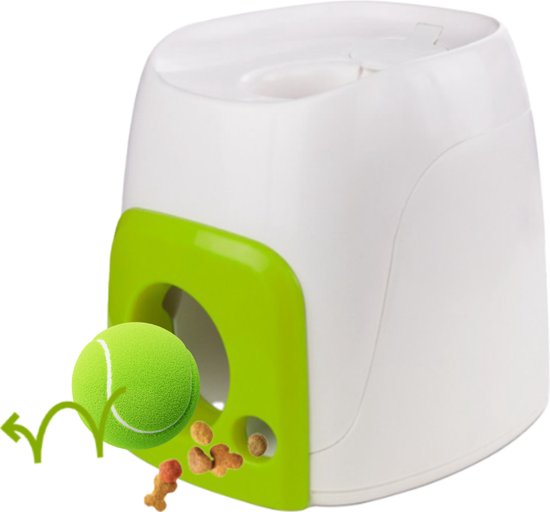 Vul het apparaat eenvoudig met droogvoer of kleine hondensnacks. Wanneer je hond de bal bovenin de machine laat vallen, rolt deze er aan de voorkant weer uit. Tegelijkertijd opent een luikje waar de traktaties uit komen. Zo leert je hond dat hij wordt beloond voor het apporteren en dat motiveert om door te gaan. De bal en voertjes rollen eruit, deze worden er dus niet uitgeschoten.