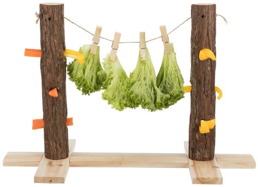 De voerboom heeft meerdere openingen waarin je groenten, takjes of kruiden kunt steken. Tussen de beide stammen hangt een touwtje waar je ook groente of andere dingen aan kunt hangen. Zo moet je dier werken voor zijn voer, wat zorgt voor mentale uitdaging en helpt verveling te voorkomen. Doordat het voer boven de grond wordt aangeboden, blijft het schoon en hygiënisch, in tegenstelling tot voer dat op de bodem ligt.